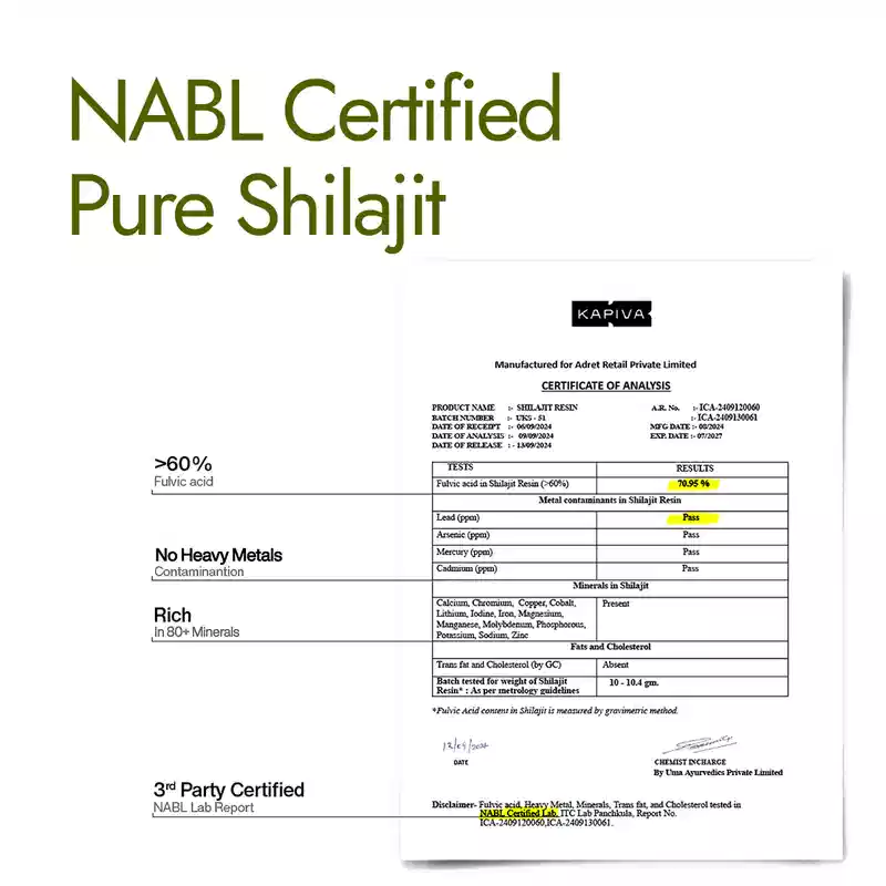 Kapiva Shilajit Resin is tested for 20+ quality and safety parameters. Every pack comes with a NABL-certified lab test report, ensuring you can verify its purity and authenticity.